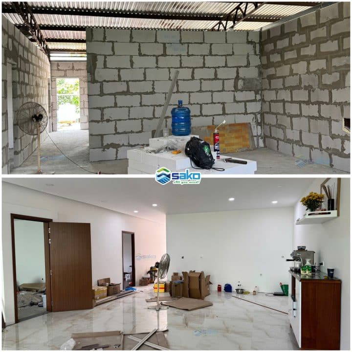 Cải tạo Nhà Kho với sàn bê tông nhẹ ALC 1500x600x75mm, 1 lưới thép. Tường xây gạch bê tông khí do SAKO cung cấp tại Quốc Lộ 13, Tp.Hồ Chí Minh. Công trình là một Nhà Kho cũ, chủ nhà cải tạo thành một căn hộ phía trên. Ở dưới làm văn phòng kinh doanh, làm việc cho Nhân Viên. Công trình tọa lạc đối diện Khu Đô Thị Vạn Phúc. Đơn vị thi công do Sako giới thiệu, tư vấn kỹ thuật, hướng dẫn thi công.