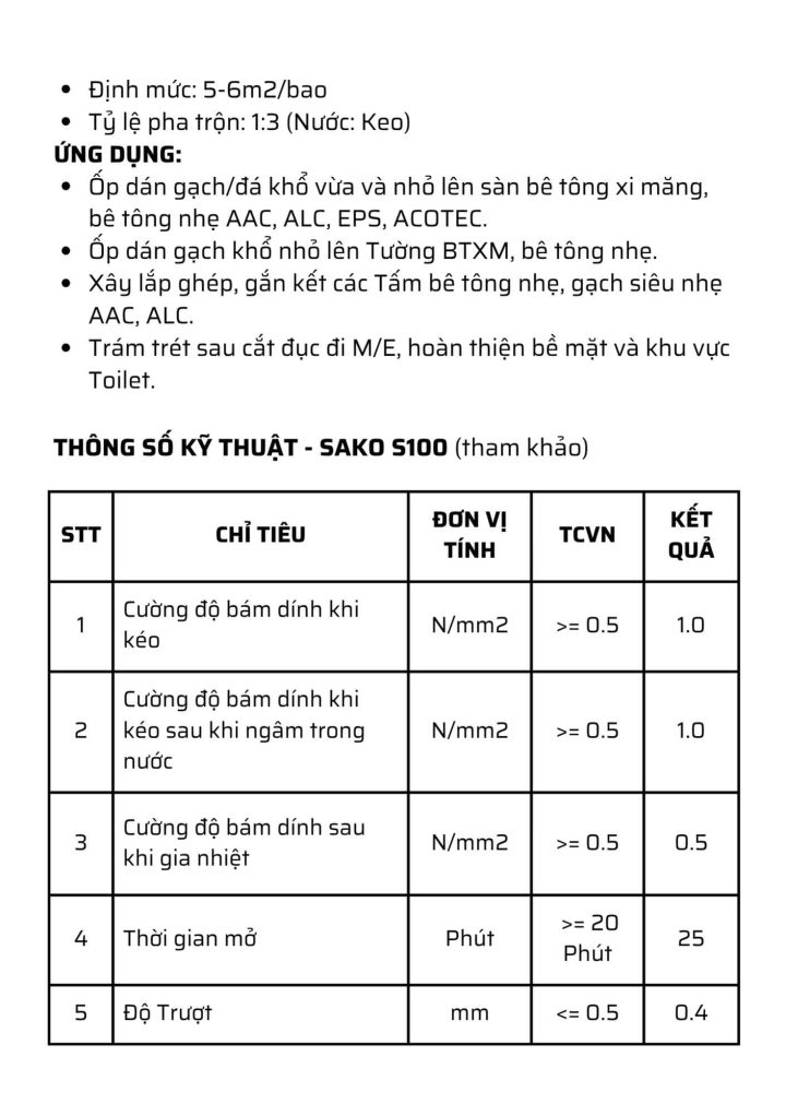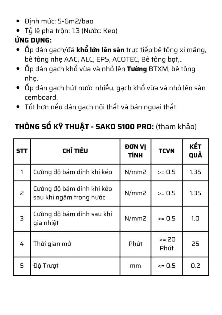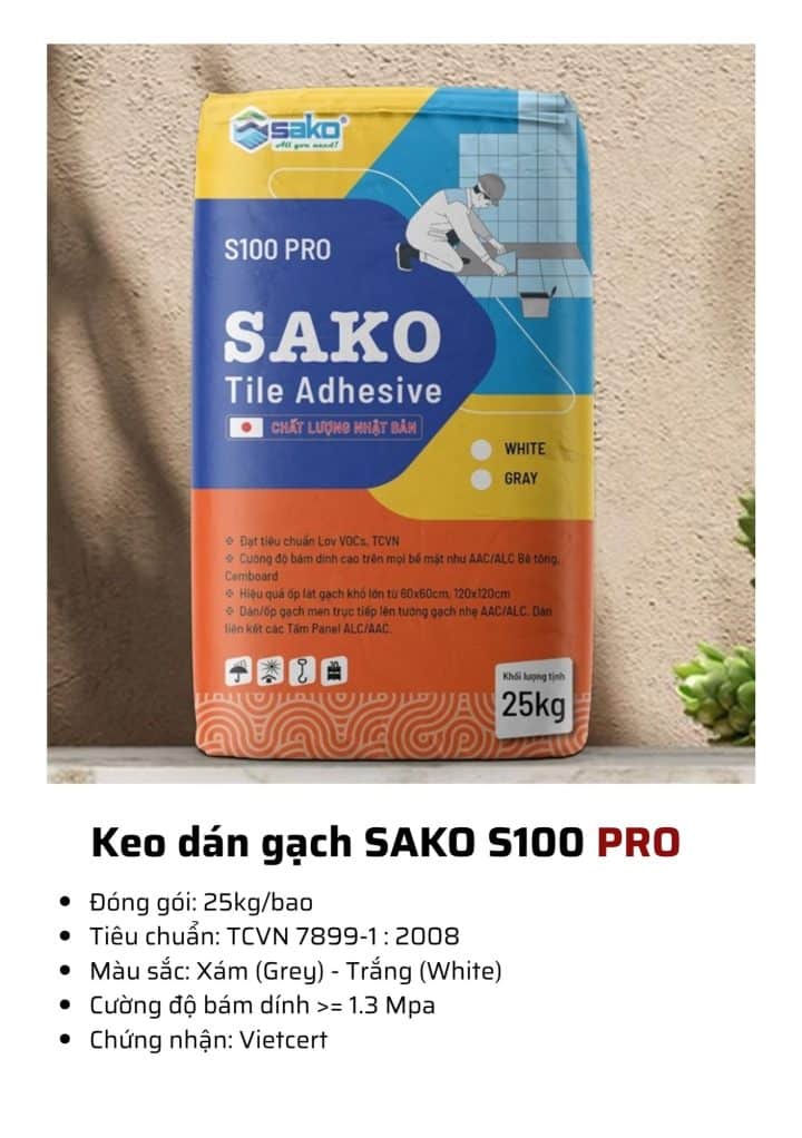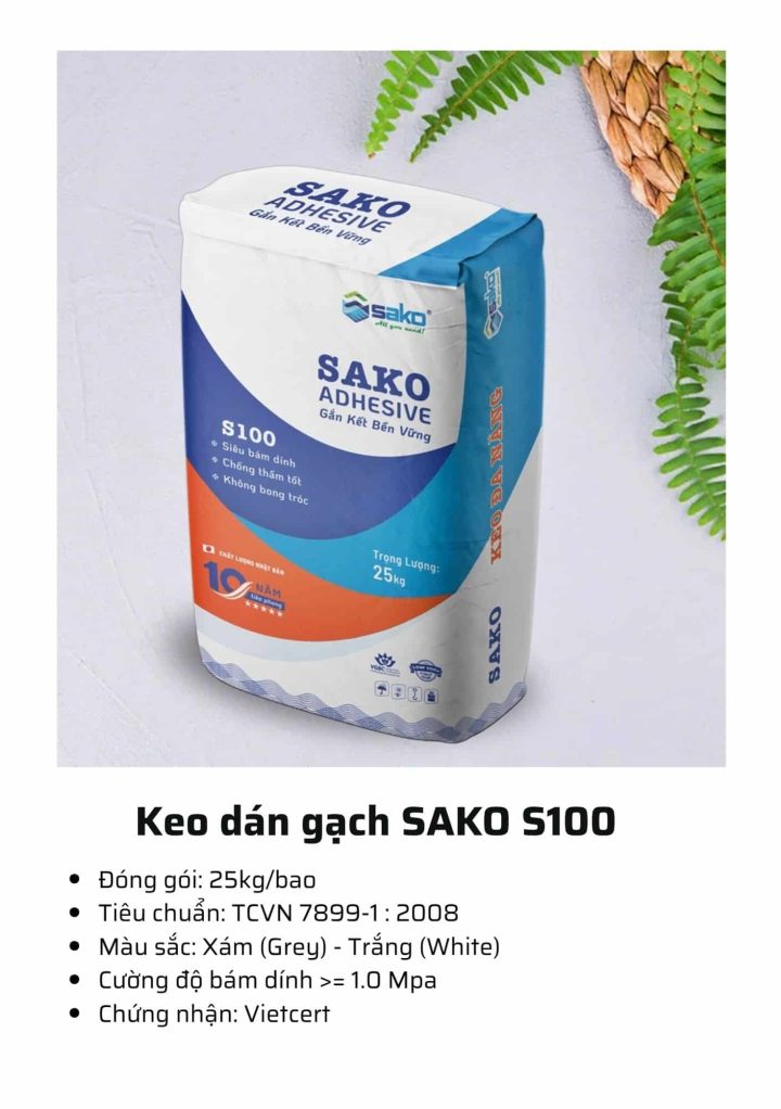 - Keo dán gạch SAKO S100 và Keo ốp lát gạch đá SAKO S100 PRO. Đây là 02 sản phẩm thuộc tiêu chuẩn C1 – Nhãn hiệu SAKO đã được đăng ký SỞ HỮU TRÍ TUỆ. Được sản xuất theo TCVN 7899-1:2008. Là 02 dòng sản phẩm ĐA NĂNG, SIÊU TIẾT KIỆM và HIỆU QUẢ CAO.