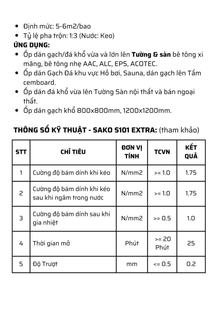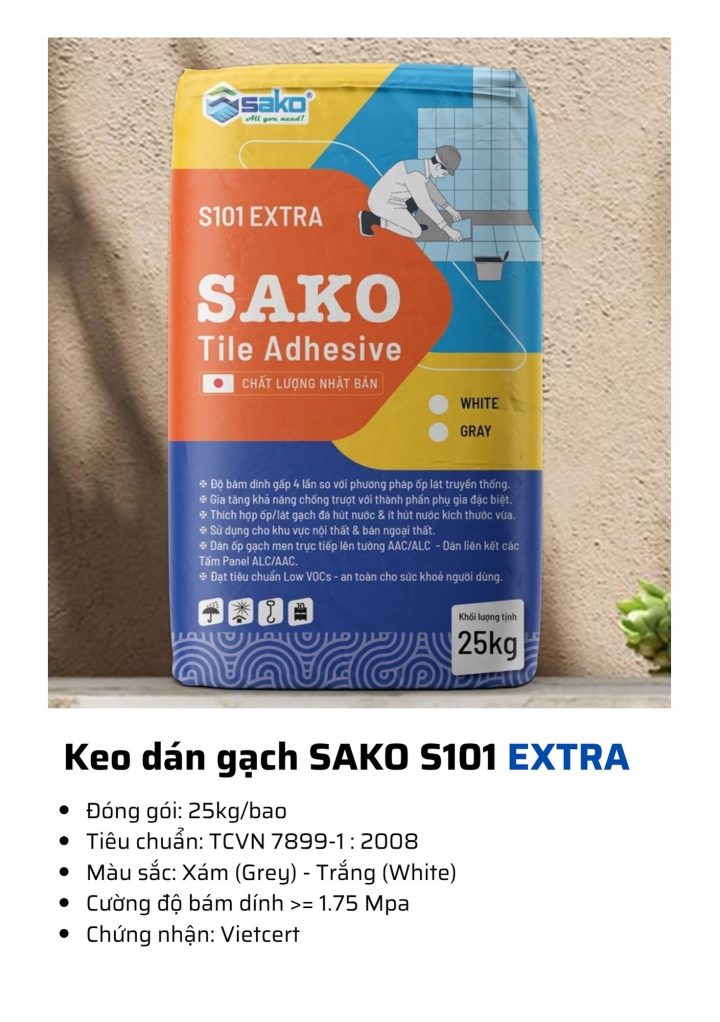 2. Keo Ốp lát gạch SAKO S101 EXTRA và Keo ốp lát gạch đá SAKO S10 GOLD. Đây là 02 sản phẩm thuộc tiêu chuẩn C2 – Nhãn hiệu SAKO đã được đăng ký SỞ HỮU TRÍ TUỆ. Được sản xuất theo TCVN 7899-1:2008. Là 02 dòng sản phẩm HIỆU QUẢ VÀ SIÊU BÁM DÍNH CAO CẤP.
