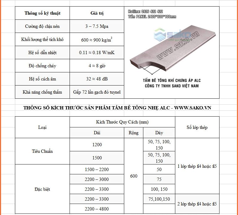 Tấm sàn bê tông nhẹ ALC là dòng sản phẩm TẤM BÊ TÔNG NHẸ CHƯNG ÁP có lõi thép. Sản phẩm được sản xuất từ bê tông chưng áp với 01, 02 lõi thép D4, D5 tiêu chuẩn. Ngàm âm dương dọc theo chiều dài Tấm giúp định hình và gia tăng kết nối. Kích thước Tấm bê tông nhẹ dài 1200:4800mm, Rộng 600mm, Dày 75mm, 100mm, 150mm, 200mm. Thông số kỹ thuật sản phẩm và kích thước tham khảo thông tin bên dưới:
